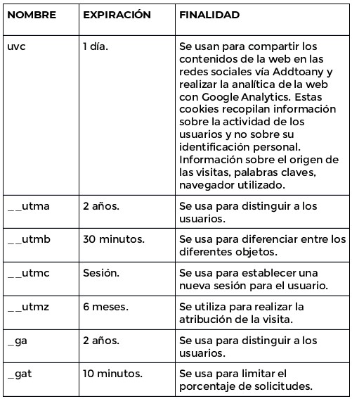 Es una aplicación de software de Google Inc. para la analítica de webs. Las cookies utilizadas recopilan datos anónimos sobre la navegación de los usuarios por la web con la finalidad de conocer el origen de las visitas, el número de veces que han visitado la web, las palabras claves utilizadas, y otros datos estadísticos. Más información en http://www.google.com/analytics/